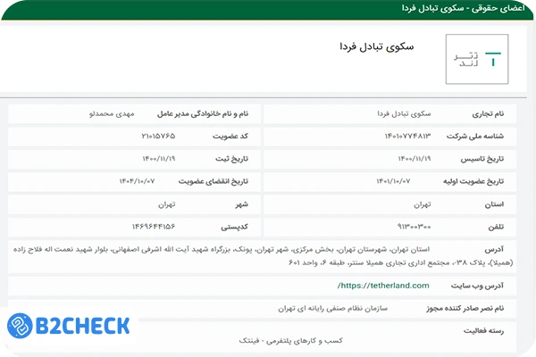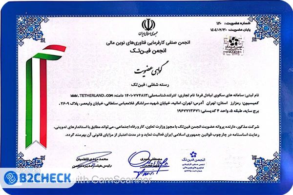 متاسفانه با بررسیهای انجام شده توسط کارشناسان بی تو چک متوجه شدیم که با وجود قرار گرفتن این مجوز در سایت؛ اما مجوزی از طرف انجمن بلاکچین ایران برای صرافی تترلند صادر نشده است یا به علت عدم تمدید مجموعه، این مجوز هم باطل شده و امکان استعلام گرفتن از آن وجود ندارد.