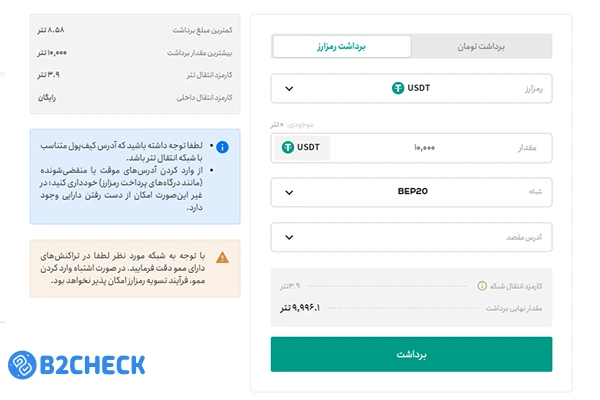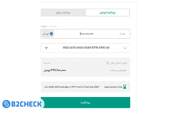 سقف برداشت تومانی تا ۵۰۰ میلیون تومان (برای کاربران ویژه) و سقف برداشت رمزارز ۱۰۰ هزار تتر است.