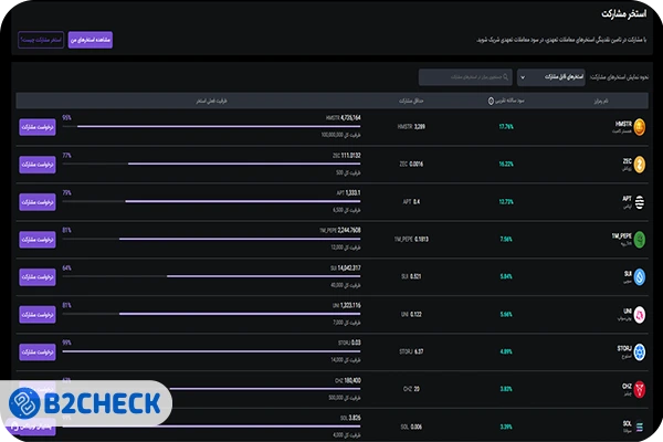 با مشارکت در استخر نوبیتکس میتوانید در تامین نقدینگی معاملات تعهدی شرکت کنید و بخشی از سود معاملات را به دست آورید. استخرهای مشارکت معمولا سود بالاتری نسبت به رشد ثروت را به تریدرها پیشنهاد میدهند؛ اما ظرفیت محدودی هم دارند. در تصویر زیر میتوانید استخرهای مشارکت دارای ظرفیت صرافی نوبیتکس را مشاهده کنید.