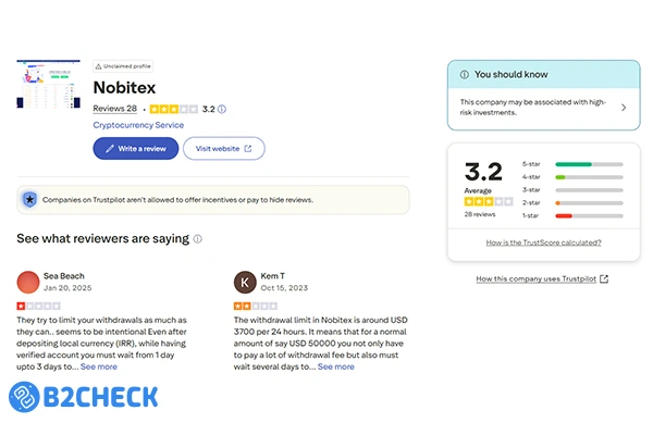 صرافی نوبیتکس در سایت معتبر تراست پایلت امتیاز متوسط ۳.۲ از ۵ را دریافت کرده است. این امتیاز از بین ۲۸ نظر کاربران این سایت داده شده است. بیشتر کاربران درباره محدودیت برداشت صرافی نوبیتکس اعتراض داشتند. در تصویر زیر میتوانید امتیاز صرافی نوبیتکس و نظرات کاربران درباره این صرافی را مشاهده کنید.
