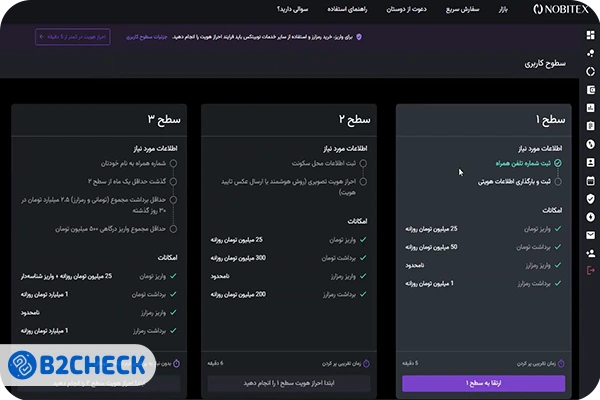 کاربران صرافی نوبیتکس در ابتدا با توجه به سطح احراز هویتشان در دسته بندیهای مختلف قرار میگیرند. هر سطح احراز هویت نیاز به یک سری مدارک و مشخصات دارد که از طرف صرافی مشخص میشود و محدودیتهای مشخصی هم در هر سطح برای تریدرها در نظر گرفته میشود.