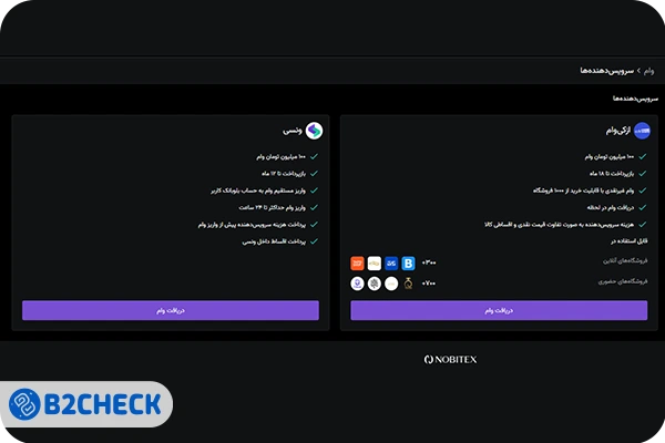 صرافی نوبیتکس همچنین امکان دریافت وام از پلتفرمهایی مانند ازکی وام و ونسی را به صورت تومانی فراهم کرده است. بازپرداخت وامهای دریافتی از پلتفرمها ۱۸ ماهه برای ازکی وام و ۱۲ ماهه برای ونسی است. سقف پرداخت وام ۱۰۰ میلیون تومان است که ازکی وام به صورت اعتبار خرید کالا اعطا میکند و ونسی به صورت مستقیم به کارت بانکیتان واریز میکند. در تصویر زیر میتوانید شرایط دریافت وام از طریق این دو پلتفرم را مشاهده کنید.