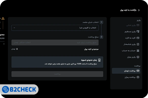 برای برداشت تومان هم نیاز است تا شماره شبای حسابتان را در صرافی انتخاب کنید و مبلغ مدنظر برای برداشت را انتخاب کنید تا در اولین سیکل پایا درخواست برداشت پردازش و به حسابتان واریز شود.