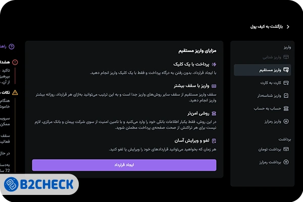 - واریز مستقیم، واریز شناسهدار، برداشت تومانی معادل 50 میلیون تومان در هر 24 ساعت