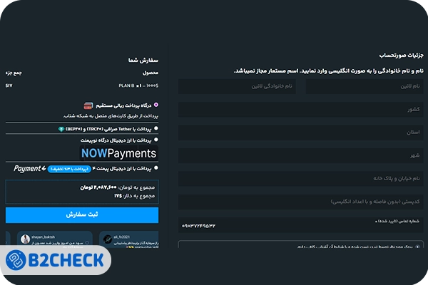 برای خرید چالش در پراپ سرمایه گذار برتر نیاز است تا یکی از چالشها را انتخاب کنید و به صفحه پرداخت بروید. در این صفحه باید مشخصات کامل خود را پر کنید. برای واریز هزینه هم باید یکی از روشهای درگاه پرداخت با کارت بانکی، پرداخت با تتر از شبکههای TRC20 و BEP20 و درگاه پرداخت ارز دیجیتال نوپیمنت را انتخاب کنید.