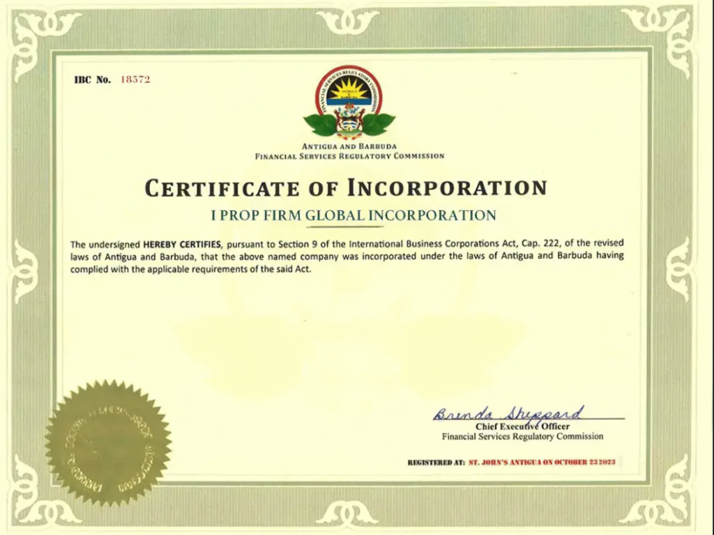 عکس دوم هم مربوط به مجوز فعالیت شرکت آی پراپ فرم تحت نظارت قوانین آنتیگو و باربودا است و هیچ کجا نامی از شرکت پراپ فرم وجود ندارد. در هیچکدام از مجوزها آی پراپ فرم بهعنوان شرکت ارائهدهنده خدمات مالی معرفی نشده است که شک و تردیدها را نسبت به این پراپ فرم بیشتر میکند.